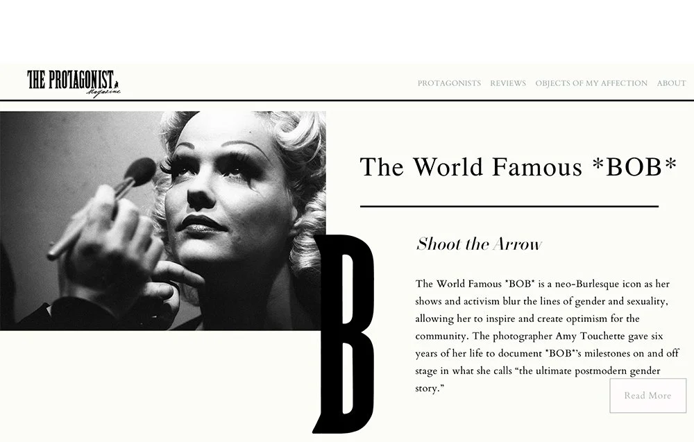 OCTOBER 8, 2022 Photographs from Shoot the Arrow: A Portrait of The World Famous *BOB* are published in The Protagonist magazine alongside an extensive interview with *BOB*, who discusses her life story and experience being photographed by Amy, among many other topics.
