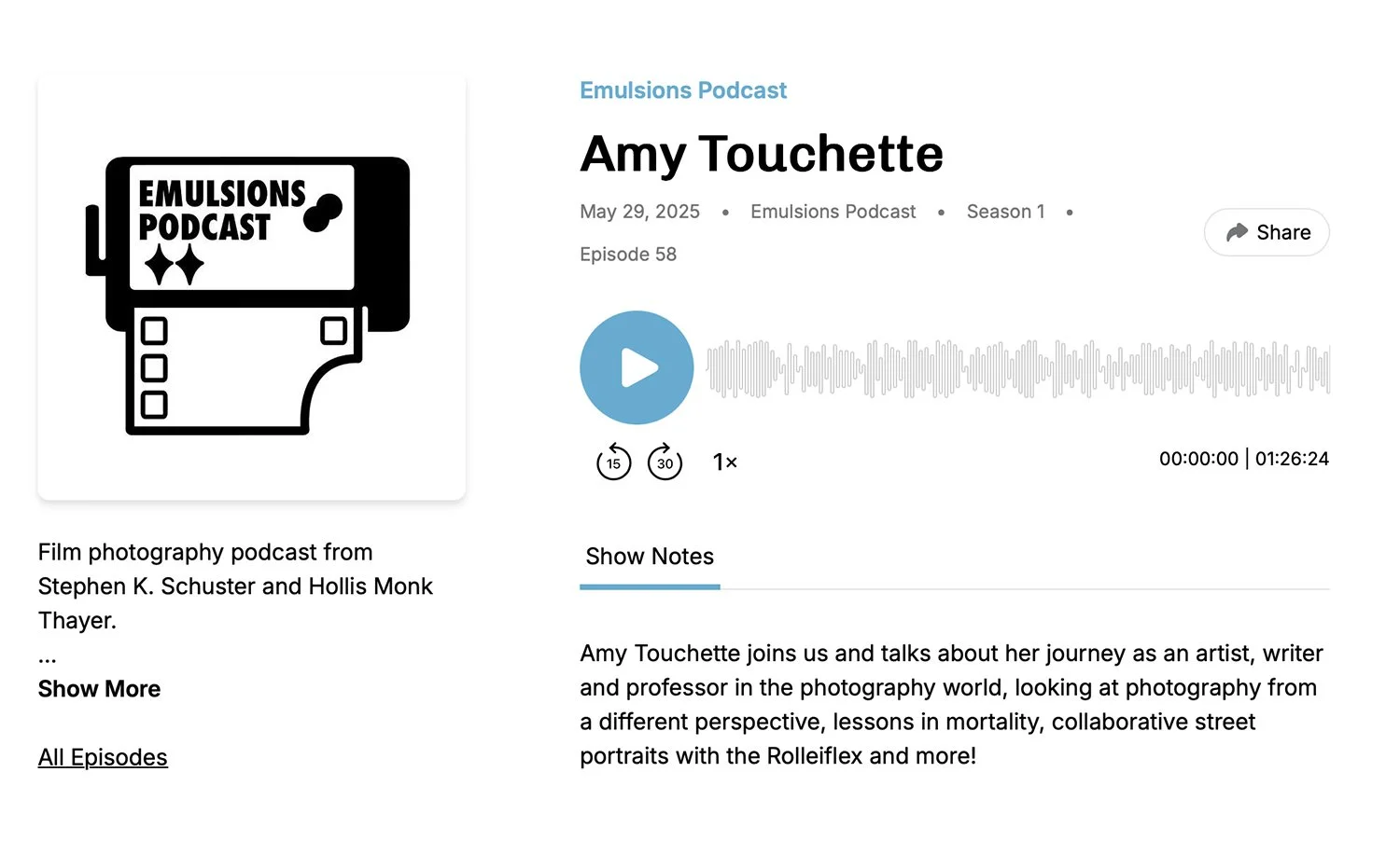 MAY 29, 2025 Amy speaks with Emulsions Podcast hosts Stephen K. Schuster and Hollis Monk Thayer about her journey as an artist, writer and professor in the photography world, looking at photography from a different perspective, lessons in mortality, collaborative street portraits with the Rolleiflex, and more.