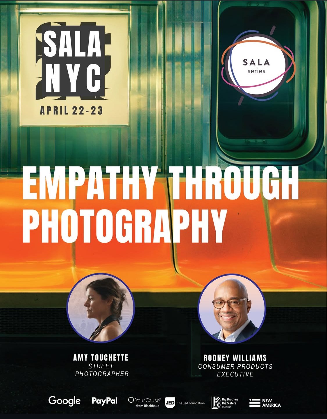 APRIL 23, 2025, 12:15-1pm Consumer Products Executive Rodney Williams hosts Amy for the discussion “Empathy Through Photography” at the SALA Summit, a two-day business and leadership conference taking place at Joe’s Pub in New York City.